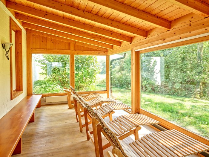 In unserem hellen, holzvertäfelten Ruheraum mit Blick auf den Park findest Du einen Ort der Stille – perfekt zum Entspannen nach einem Saunagang oder Bad.