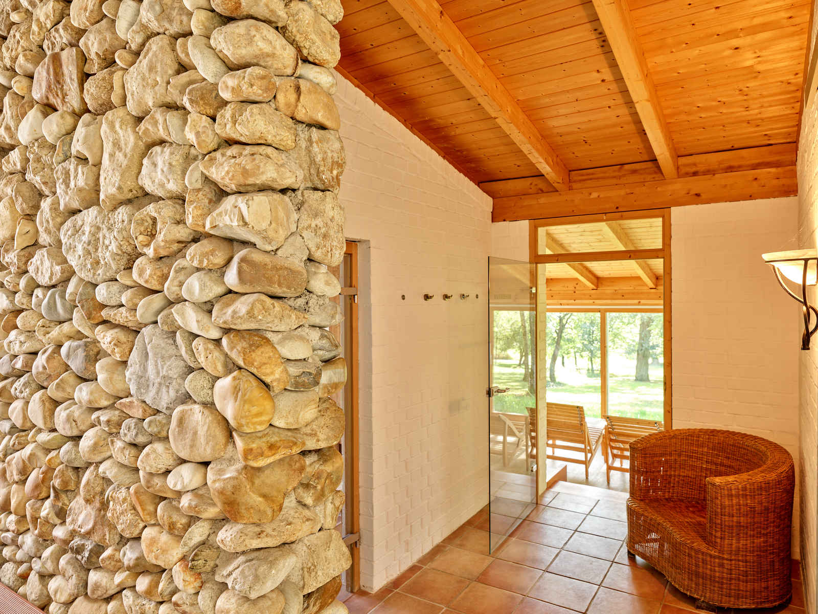 - Ansicht: Blick auf den Garten, Einzelbett 90x200cm, Dusche, WC, Fön, Kosmetikspiegel, WLAN, Bademantel, Saunahandtuch